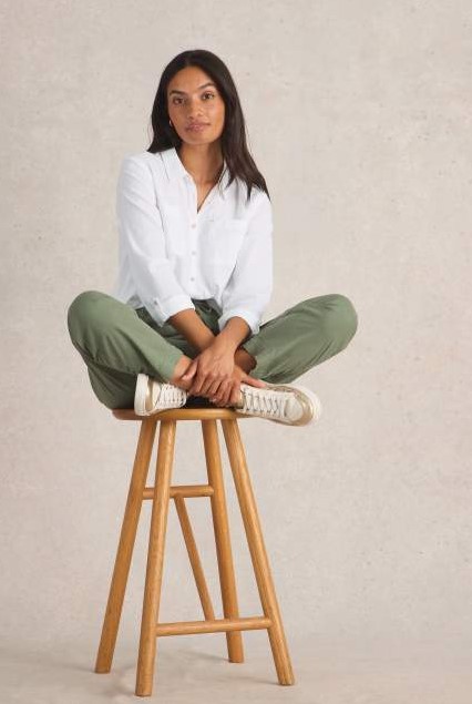 Het model draagt maat 10 en is 175 cm lang.